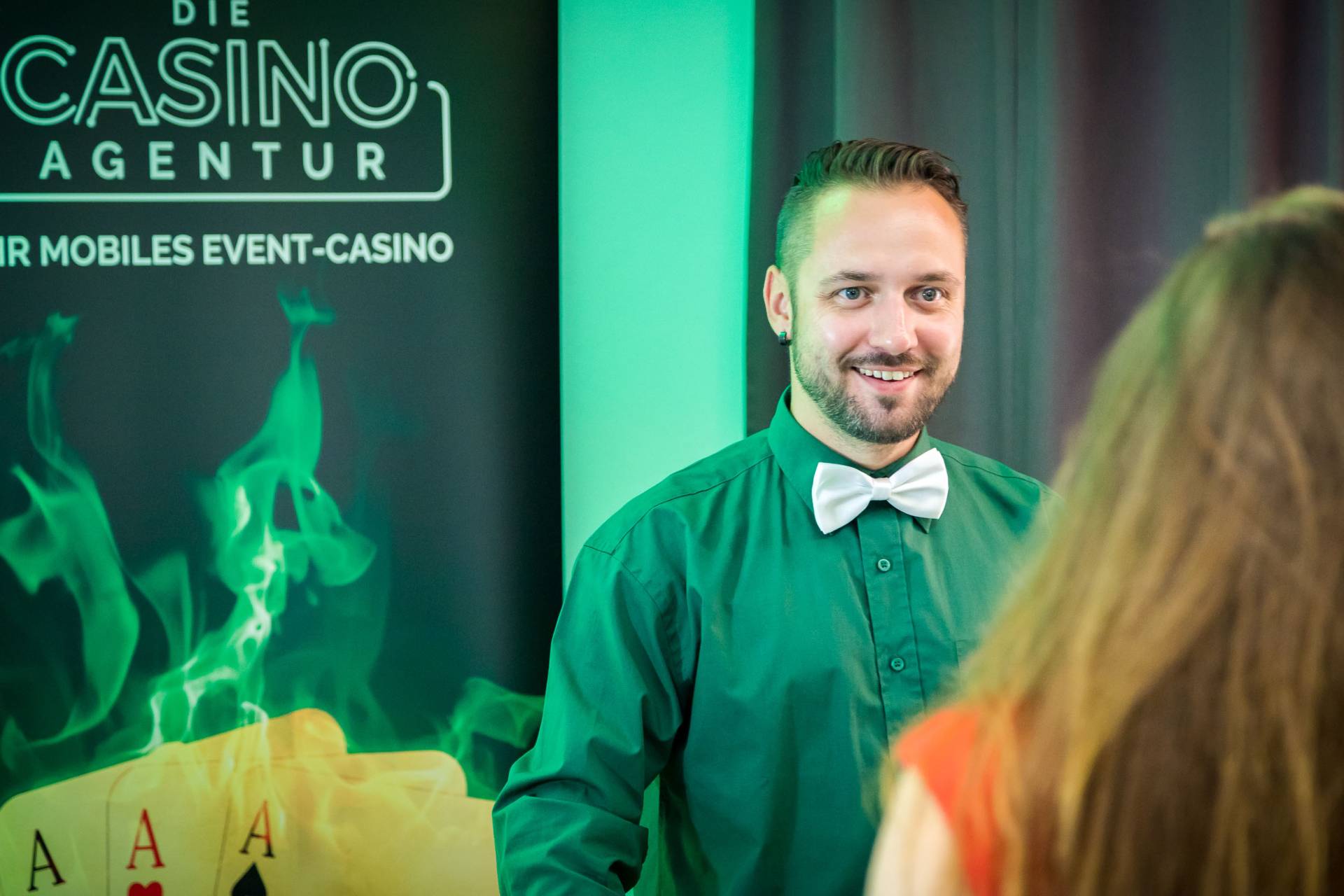 Jeder Spieltisch wird von einem Croupier betreut. Unterhaltsam sorgt er dafür, dass sich der Roulette-Kessel dreht & Karten gegeben werden. Mit Charme und Witz werden Spielregeln erklärt & Gewinne ausgezahlt. Quizmaster sorgen auch abseits der Spieltische für Unterhaltung!